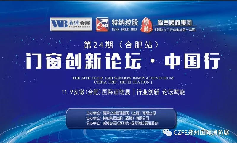 由特納集團控股(香港)有限公司協辦,儒聲企業管理顧問(上海)有限公司、香港門窗創新研究院(中國)有限公司、金華市儒聲網絡科技有限公司主辦,威博會展|CZFE鄭州國際消防展組委會承辦的“第24期《防火門窗行業創新論壇.中國行》(合肥站)”于2018年11月10日在合肥濱湖國際會展中心(5號館)“11.9安徽(合肥)國際消防展”論壇區舉行,敬請關注!