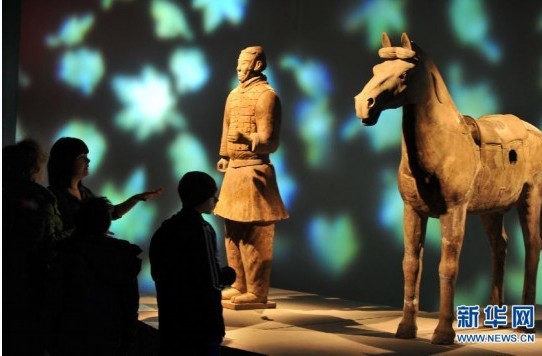 4月25日,觀眾在美國(guó)紐約參觀展出的中國(guó)秦朝兵馬俑。當(dāng)天,以兵馬俑為主題的“兵馬俑:中國(guó)始皇帝的衛(wèi)兵”主題展覽在紐約舉行預(yù)展,包括秦始皇兵馬俑在內(nèi)的數(shù)百件國(guó)家級(jí)文物展出。這是紐約首次舉行以兵馬俑為主題的展覽。展覽將于27日向公眾開(kāi)放。(來(lái)源:新華網(wǎng))
