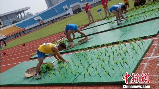 5月17日,廣西第七屆農民運動會呈現出“農忙”景象。當日,插秧比賽在柳州市體育中心進行,農民運動員在比賽中不僅需要比拼耐力,還要比拼技巧和速度。(來源:中新網)