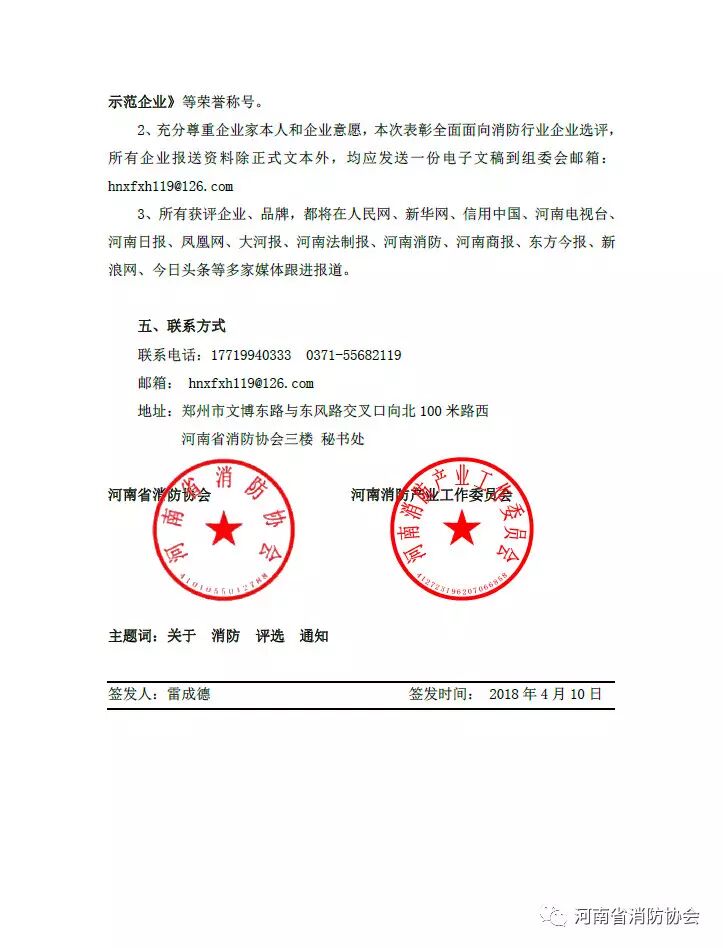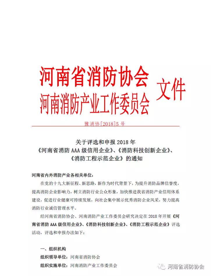 關于評選和申報2018年 《河南省消防AAA級信用企業》、《消防科技創新企業》、 《消防工程示范企業》的通知