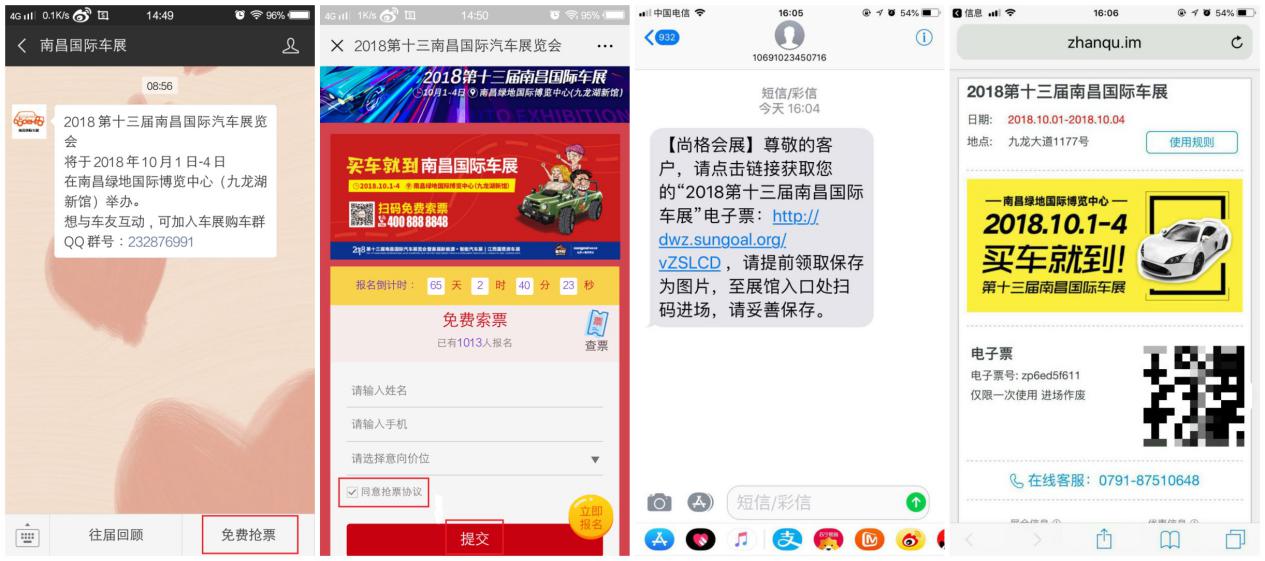 本屆南昌國際車展的免費搶票福利也已全面上線。只需關注“南昌國際車展”微信號,點擊下方【免費搶票】進入頁面提交信息即可。官方客服電話回訪核對信息后,電子門票直接發(fā)送到您的手機上,點開鏈接查看電子票;入場前可以進入官方微信【南昌國際車展】點擊菜單【票證查詢】進入查詢頁面即可打開電子票圖片;