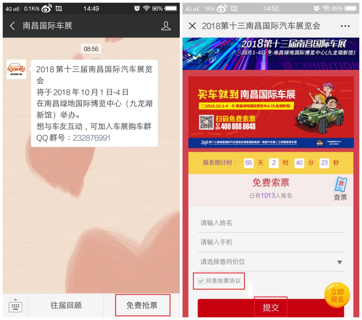 另外本屆南昌國際車展的免費搶票福利已全面上線。只需微信關注“南昌國際車展”,點擊菜單欄【免費搶票】進入頁面提交信息即可。