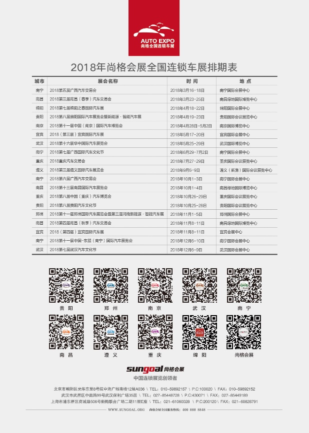 尚格會展,勵精圖治23年,在武漢、南京、南昌、鄭州、貴陽、遵義、綿陽、宜賓、重慶、南寧等十余城市,每年舉辦20余場車展,年組展面積超100萬平方米,尚格以“夸父逐日”的精神持續探索著行業。近年來車市緩增,會展業同質化嚴重,在此巨大的商戰變革中,尚格逆勢突圍、撥亂反正,穩坐中國二三線城市車展的龍頭交椅。限量免費搶票瘋狂進行中,點我點我。