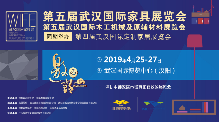 第五屆武漢國際家具\木工機械及原輔材料展覽會將于2019年4月25日-27日在武漢國際博覽中心召開。參展企業及產品涵蓋了整個家具行業的各個方面,展會期間,將同期舉辦第四屆武漢國際定制家居展覽會,為參展企業深耕中部家居市場提供高效的交流合作平臺。