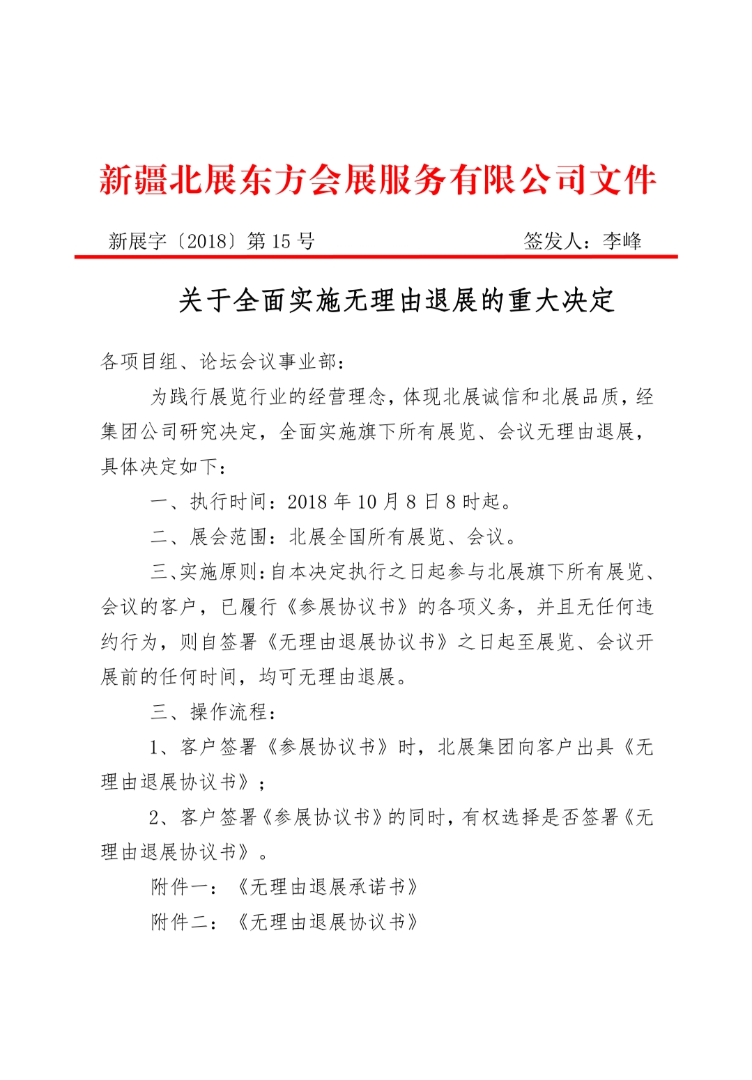 會展產(chǎn)業(yè)是國內(nèi)近幾年來高速發(fā)展起來的產(chǎn)業(yè)。國內(nèi)開始正式提出展會這個概念大約在1998年—1999年之間。北展東方作為一家僅僅成立兩年時間的年輕組展公司,雖是新軍,然而初生牛犢不怕虎,憑借專業(yè)能力和熱情服務(wù),已在暖通展會領(lǐng)域占有一席之地。今天,對于新疆北展東方會展服務(wù)有限公司和整個會展行業(yè)來說注定非同尋常,經(jīng)討論公司做出慎重決定——北展旗下所有展會不滿意無條件退展。