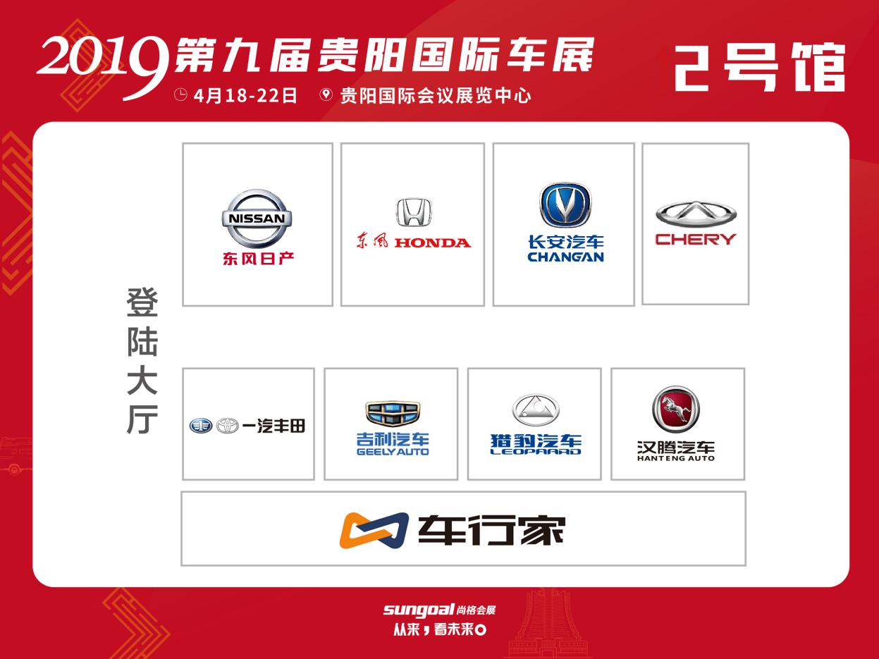 2號(hào)館(按順時(shí)針?lè)较颍簴|風(fēng)日產(chǎn)、東風(fēng)本田、長(zhǎng)安汽車(chē)、奇瑞、漢騰汽車(chē)、獵豹汽車(chē)、吉利汽車(chē)、一汽豐田