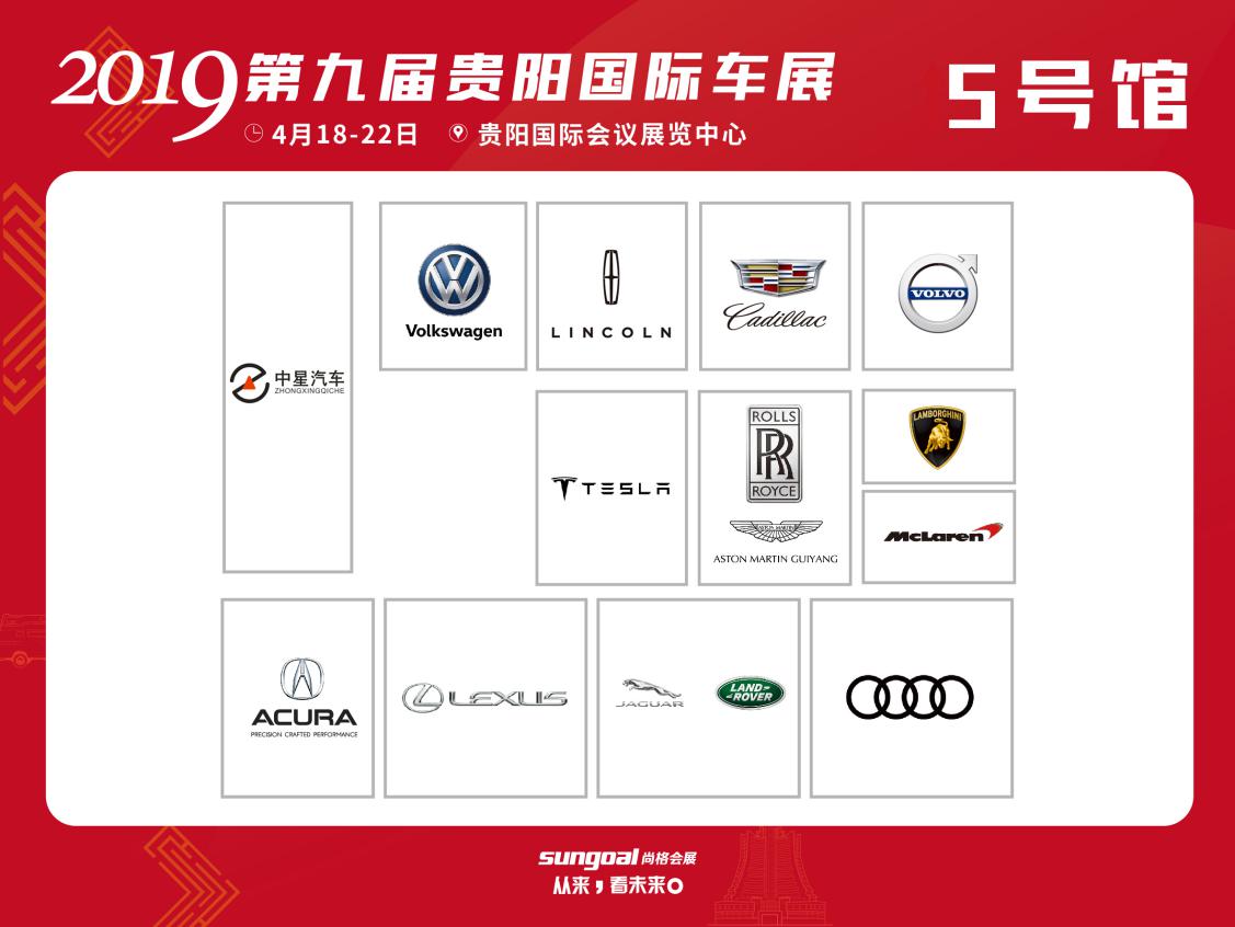 5號(hào)館(按順時(shí)針?lè)较颍褐行瞧?chē)、進(jìn)口大眾、林肯、凱迪拉克、沃爾沃、蘭博基尼、邁凱倫、勞斯萊斯、阿斯頓馬丁、特斯拉、奧迪、路虎、捷豹、雷克薩斯、謳歌