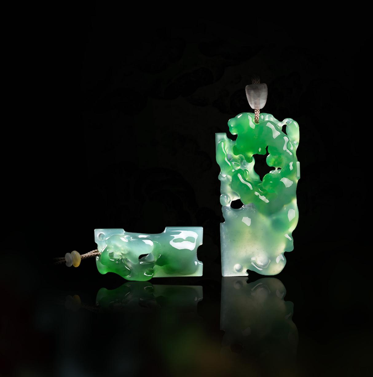 化境系列,意在還原翡翠中自然天成的美感。結合其質,形,色,意,以流暢的線條,呈現玉石雅致清逸,意境空明的天然之美。該系列作品造型抽象,在純凈靈透中展現空靈寂靜之美。在清心自由的狀態中,加以想象,感知,它或是水,是魚,是舞者,是一切生靈……成萬物之法變,應無所住而通其心,遂漸入佳境。