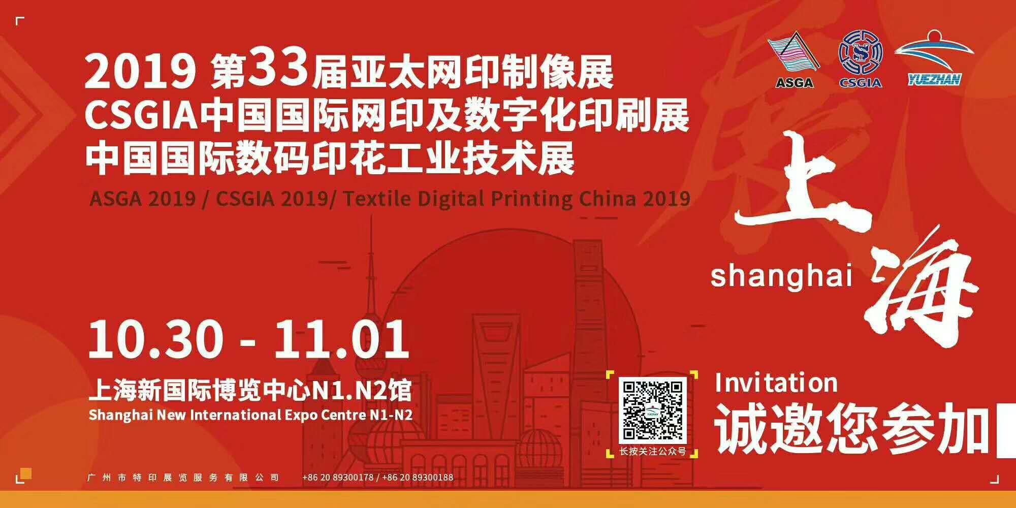 2019年亞太網(wǎng)印制像展、CSGIA 中國國際網(wǎng)印及數(shù)字化印刷展兩大品牌聯(lián)手將于2019年10月30日-11月1日在上海浦東新國際博覽中心給大家呈現(xiàn)絲網(wǎng)印刷、紡織品印花、數(shù)碼印花與廣告標(biāo)識完美融合的主題盛會。屆時,我們將推出第10屆亞太精品評比和第19屆金網(wǎng)獎精品評比,真誠歡迎行業(yè)內(nèi)網(wǎng)印數(shù)碼印刷企業(yè)的積極參與。