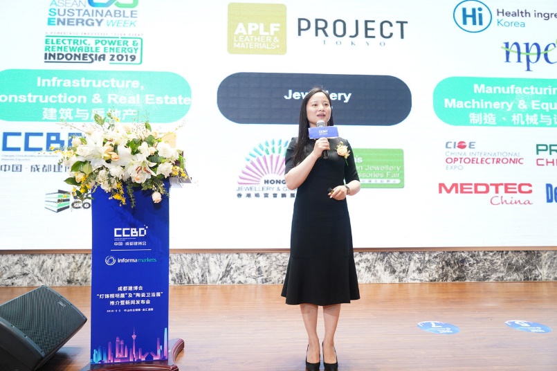 發布會首先由英富曼Informa Markets中國董事總經理龔康康發表致辭,她指出,成都建博會與英富曼集團牽手已經三年了,無論是從展會的規模還是影響力上都獲得很大的提升。這次我們與中國建筑材料流通協會共同打造“燈飾照明”和“陶瓷衛浴”兩個全新的板塊,相信一定能讓成都建博會如虎添翼,不僅保持在中西部首屈一指的地位,也將成為在全國極具影響力的重點品牌展會。