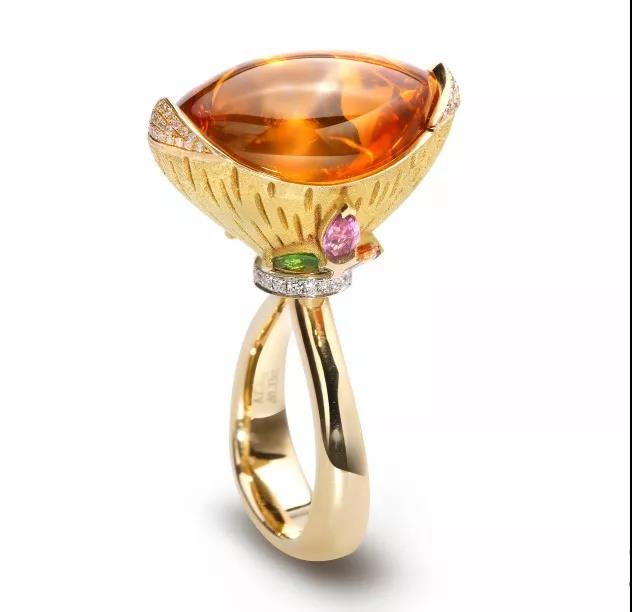 芬達(dá)石的致色元素是鐵和錳,決定它能夠呈現(xiàn)出猶如芬達(dá)般純凈鮮艷而又明亮的橙色,使得它在歐美市場受到熱烈歡迎。不少知名的珠寶品牌,如今都開始采用優(yōu)質(zhì)的芬達(dá)石作為創(chuàng)作靈感,設(shè)計(jì)了一系列夢幻的珠寶作品。