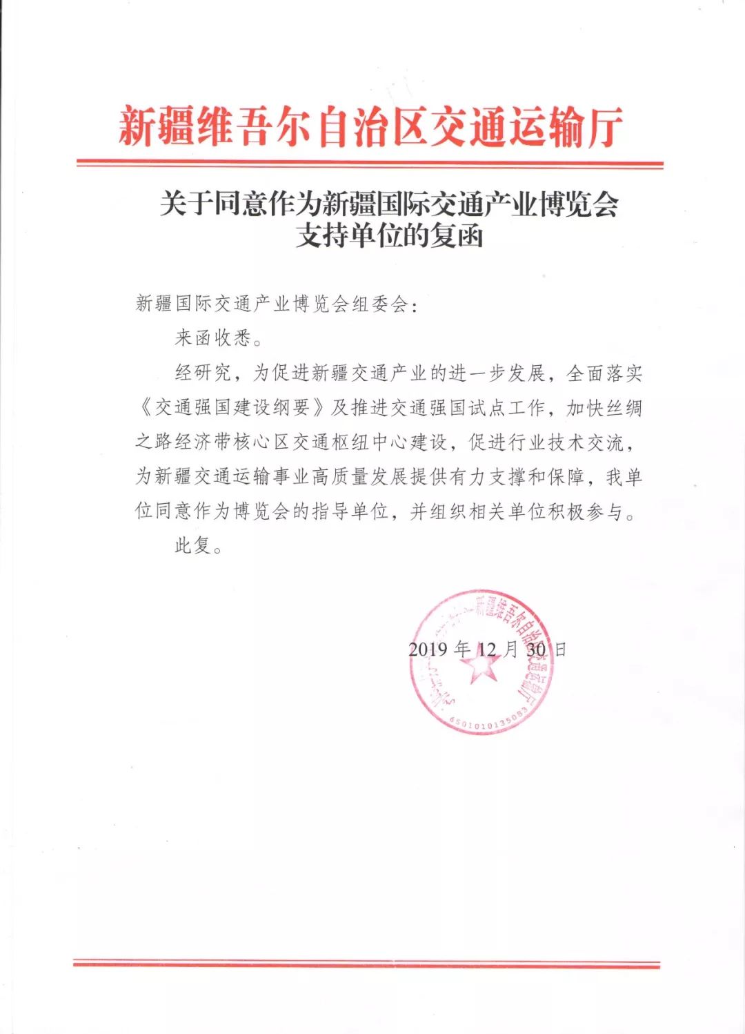 新疆維吾爾自治區交通運輸廳正式回函成為2020新疆交通國際產業博覽會支持指導單位