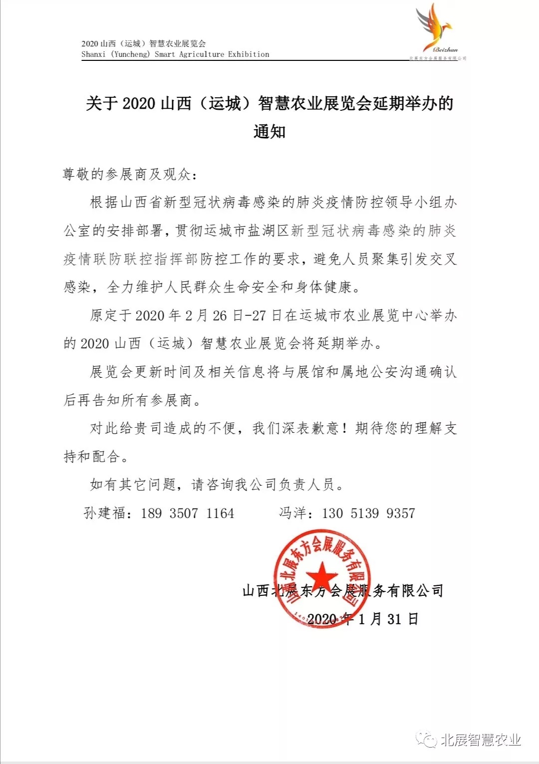 自新型冠狀病毒感染肺炎疫情發生以來,舉國上下高度重視,全民全力防控。為響應及配合山西省新型冠狀病毒感染的肺炎疫情防控領導小組辦公室的安排部署,貫徹運城市鹽湖區新型冠狀病毒感染的肺炎疫情聯防聯控指揮部防控工作的要求,確保各參展商及觀眾的身體健康和生命安全,原定于2020年2月26-27日在運城市農業展覽中心召開的山西(運城)智慧展覽會將延期舉行。