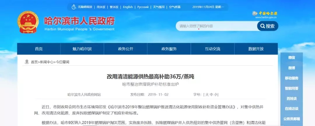 去年哈爾濱市財政局會同哈爾濱市生態(tài)環(huán)境局印發(fā)《哈爾濱市2019年整治燃煤鍋爐推進(jìn)清潔化能源使用財政補(bǔ)助資金管理辦法》,對集中供熱并網(wǎng)、改用清潔化能源、廢棄拆除燃煤鍋爐制定了相應(yīng)補(bǔ)助標(biāo)準(zhǔn)。