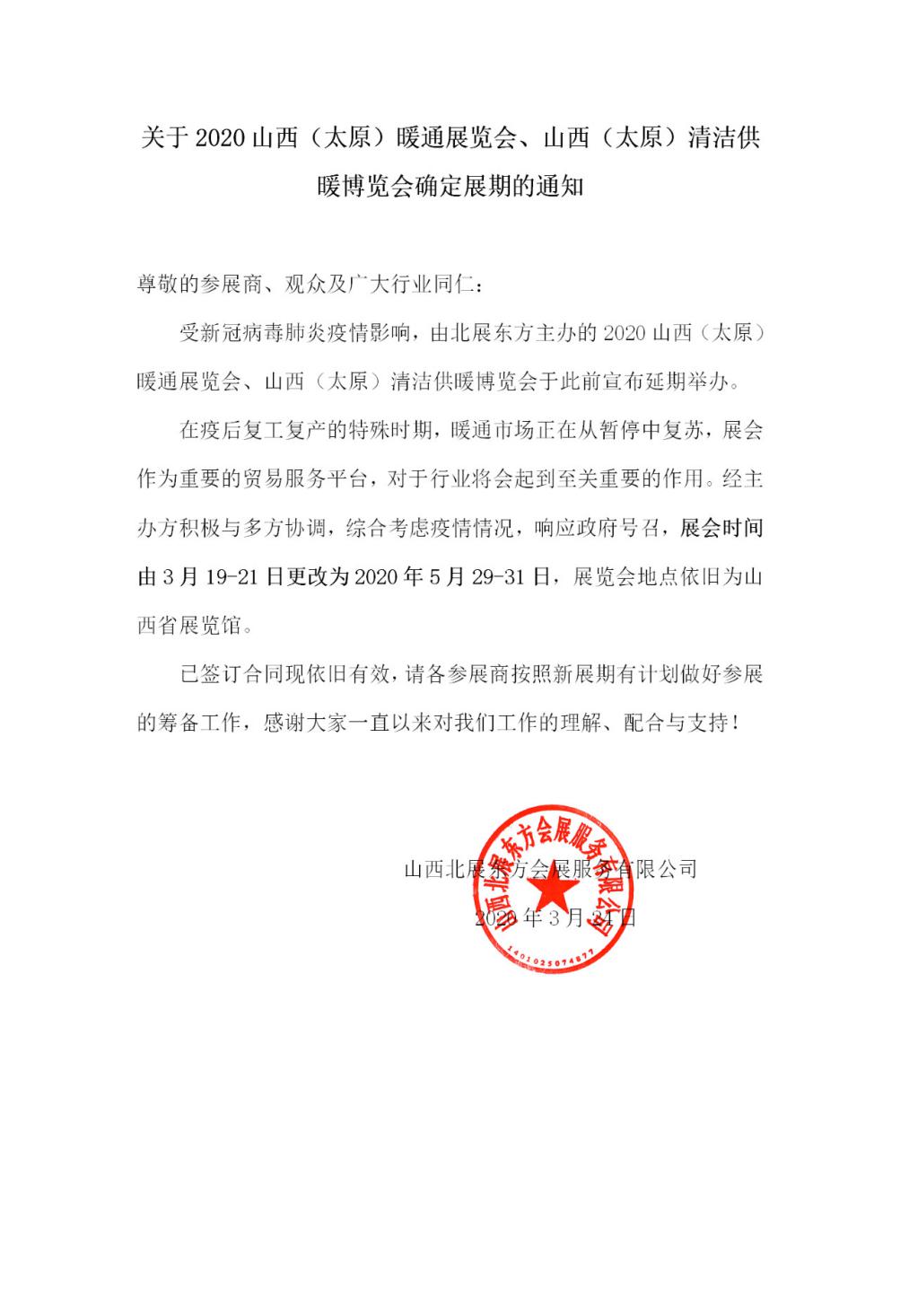 根據新型肺炎疫情防控需要,為貫徹落實黨中央和山西省政府做好新型冠狀病毒感染的肺炎疫情防控工作,切實保障廣大參展商和觀眾及各界朋友們的健康安全,確保參展企業的參展效果和采購商的參觀體驗,原定于3月19-21日在山西舉辦的2020山西(太原)暖通展覽會延期至5月29-31日舉辦。