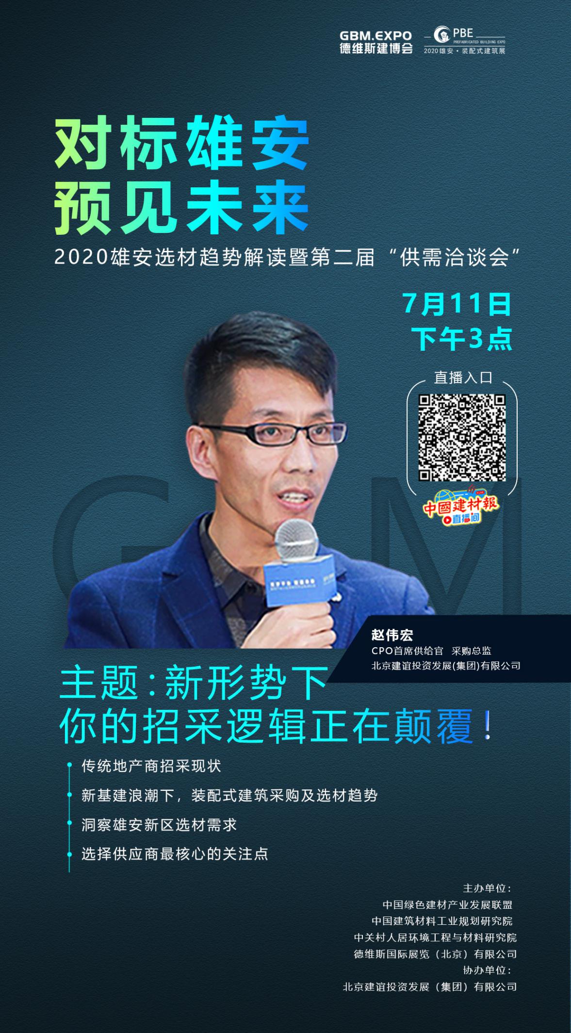 2020年7月11日,第四屆雄安德維斯建博會線上直播系列活動之——對標(biāo)雄安,預(yù)見未來:2020雄安選材趨勢解讀暨第二屆“供需洽談會”將邀請北京建誼投資發(fā)展(集團(tuán))有限公司采購總監(jiān)趙偉宏,分享傳統(tǒng)地產(chǎn)商招采現(xiàn)狀及新基建浪潮下裝配式建筑采購選材趨勢,講述海外地域經(jīng)濟(jì)招采管理經(jīng)驗、雄安新區(qū)選材要求。