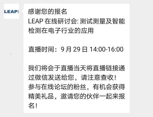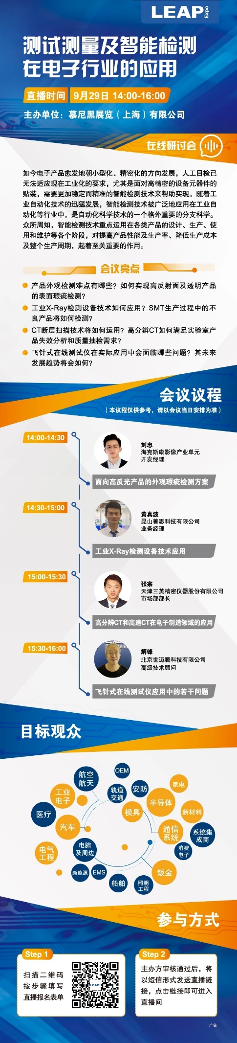 為了對測試測量及智能檢測技術(shù)進(jìn)行更加深度的剖析和探討,LEAP將于9月29日14:00-16:00以“測試測量及智能檢測在電子行業(yè)的應(yīng)用”為主題,舉辦在線研討會(huì)。四位行業(yè)重磅嘉賓將親臨直播間,分享其專業(yè)的判斷與獨(dú)到的見解。