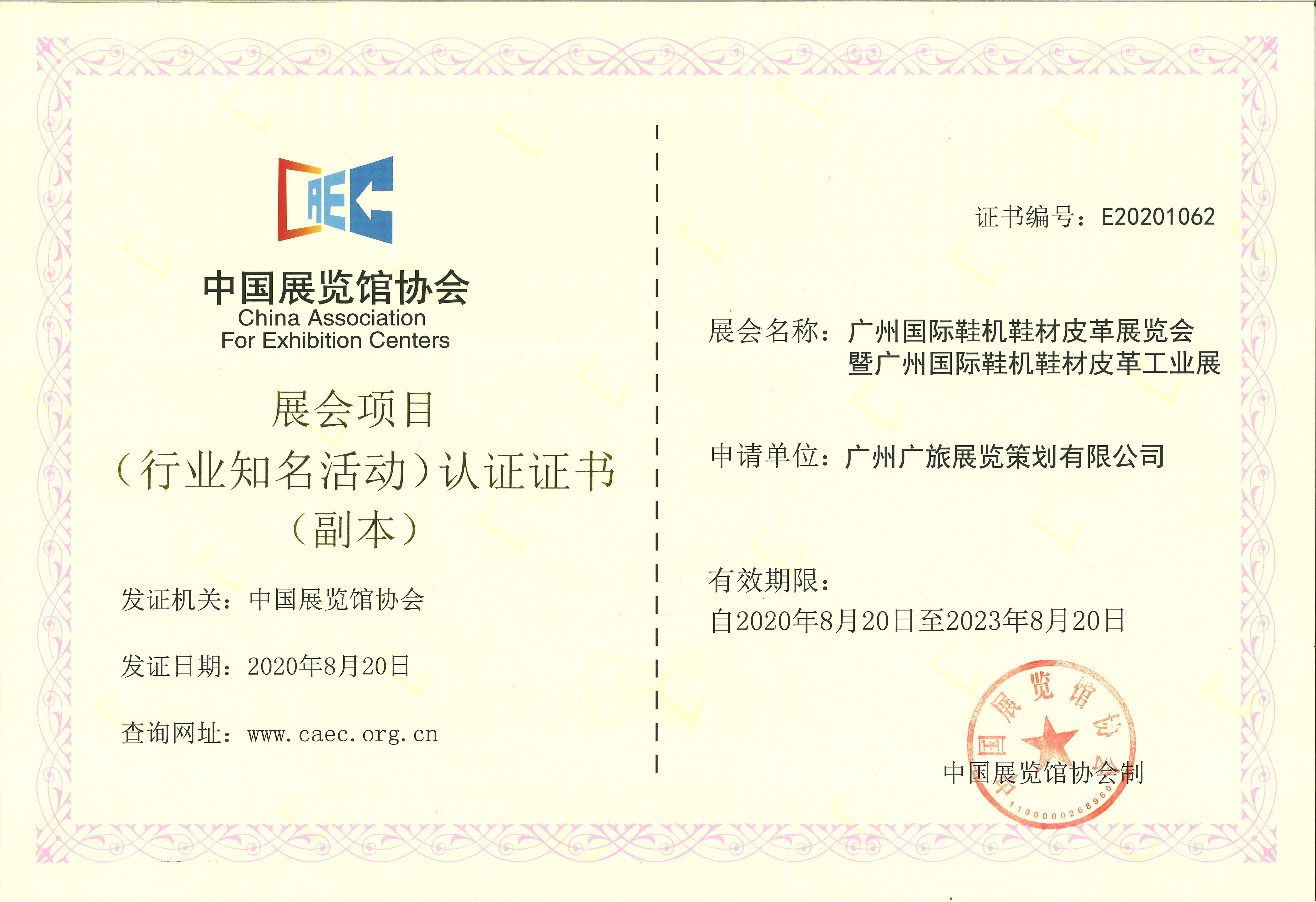 獲中國展覽館協會認證2021廣州國際鞋機鞋材皮革工業展再添新榮譽