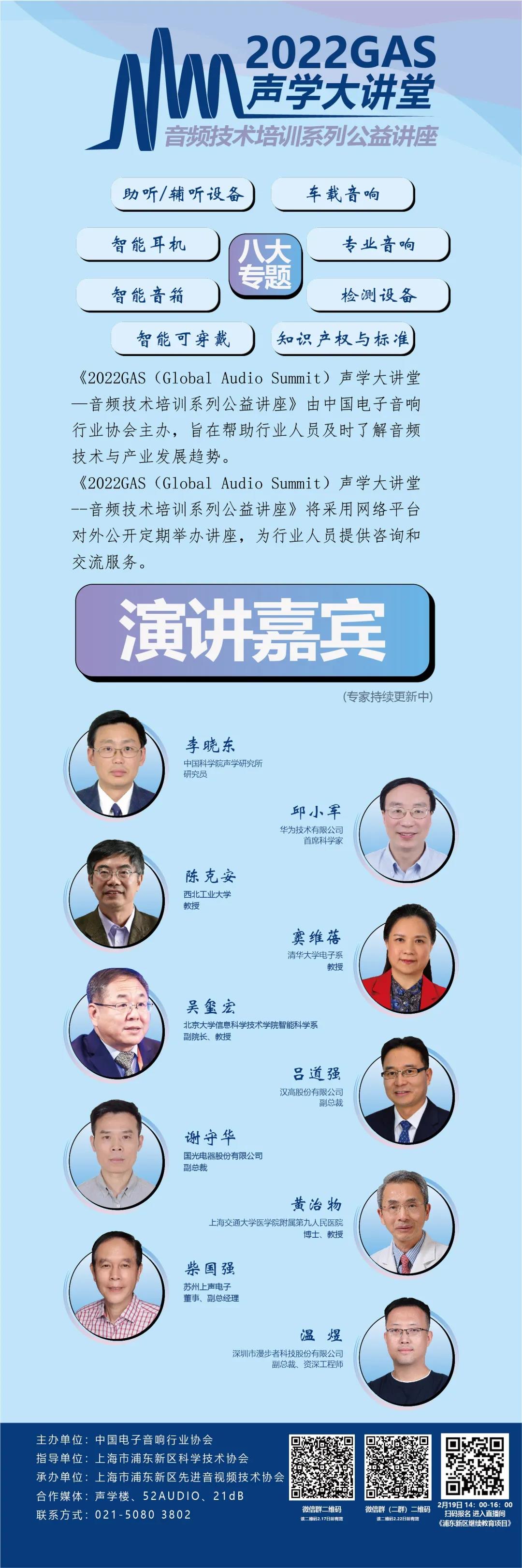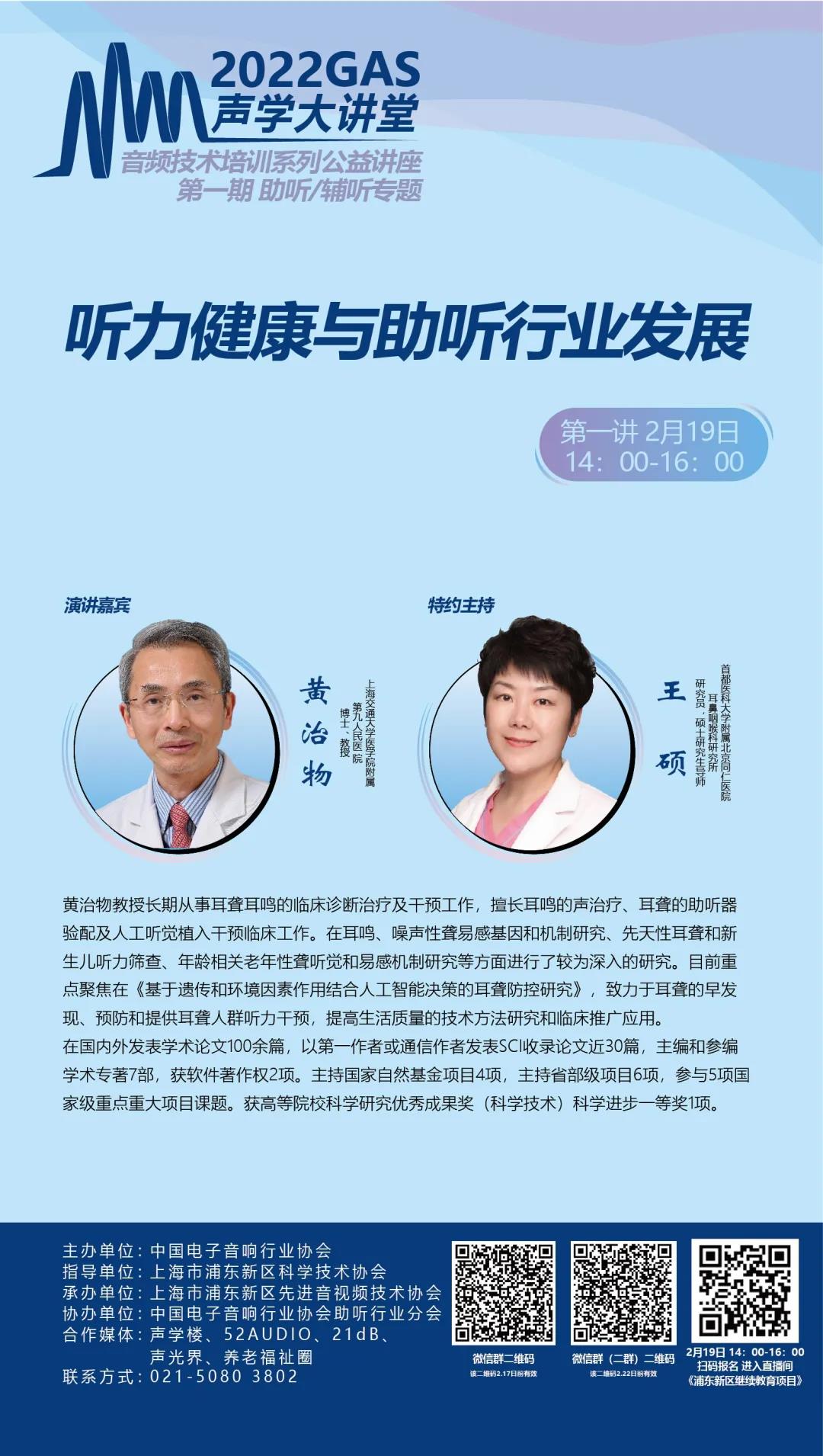 2022年2月19日下午2點,協會將正式舉辦《2022GAS聲學大講堂—音頻技術培訓系列公益講座》啟動大會,來自上海交通大學醫學院附屬第九人民醫院的黃治物教授為大家分享《聽力健康與助聽行業發展》。