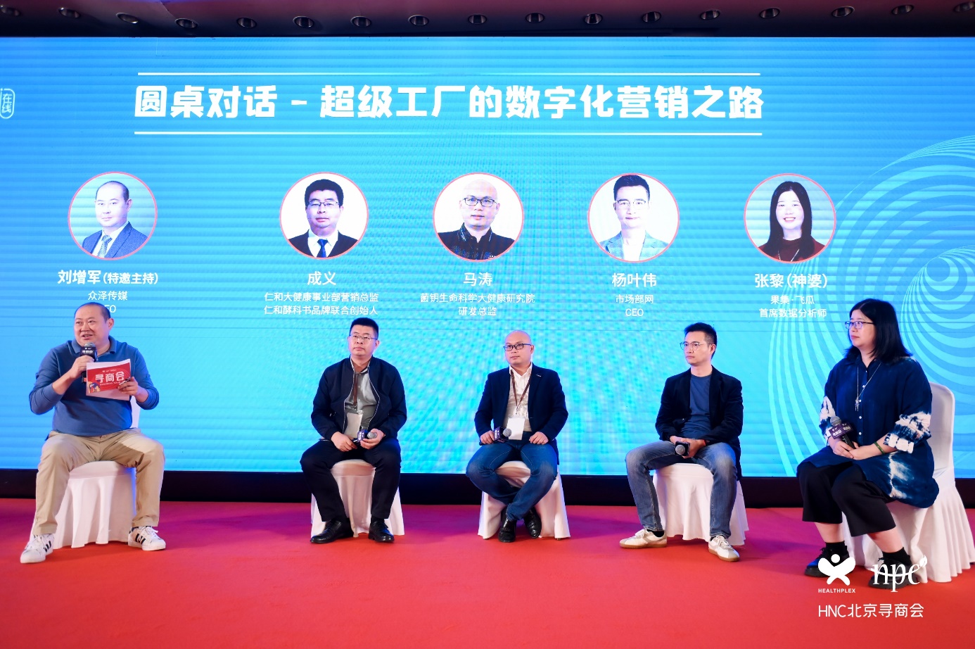 從左至右:眾澤傳媒CEO劉增軍(主持)、仁和大健康事業部營銷總監 、仁和酵科書品牌聯合創始人成義、菌鑰生命科學大健康研究院研發總監馬濤、市場部網CEO楊葉偉、果集•飛瓜首席數據分析師 神婆