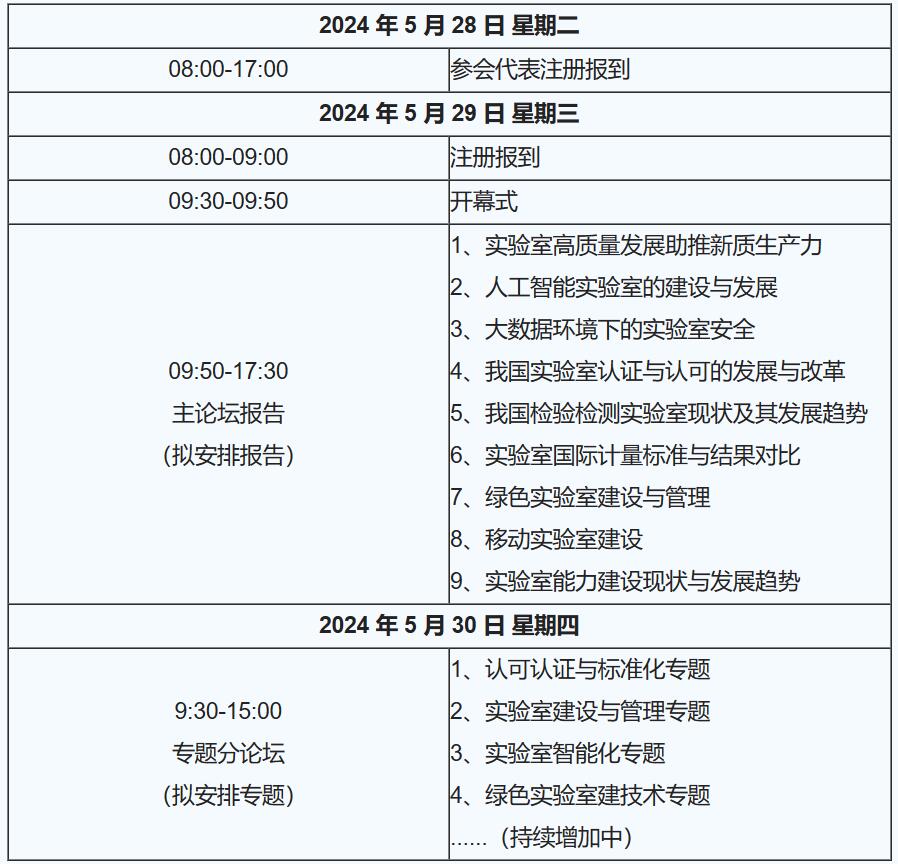 為推進我國實驗室技術的發展,提升實驗室綜合水平,促進國內外行業間的相互交流與合作,中國儀器儀表行業協會、世信國際會展集團研究決定于 2024年5月29日-30日在中國國際展覽中心順義館舉辦“第五屆中國實驗室發展大會”(以下簡稱大會),本屆大會將與第二十一屆中國國際科學儀器及實驗室裝備展覽會同期召開。 本屆大會將繼續以“智慧、安全、綠色、創新”為主題,聚焦我 國實驗室建設與管理、實驗室安全、智慧實驗室、實驗室認證認可、 實驗室數據管理、危化品管理、標準物質、實驗動物等話題,進行深入研討和經驗交流。