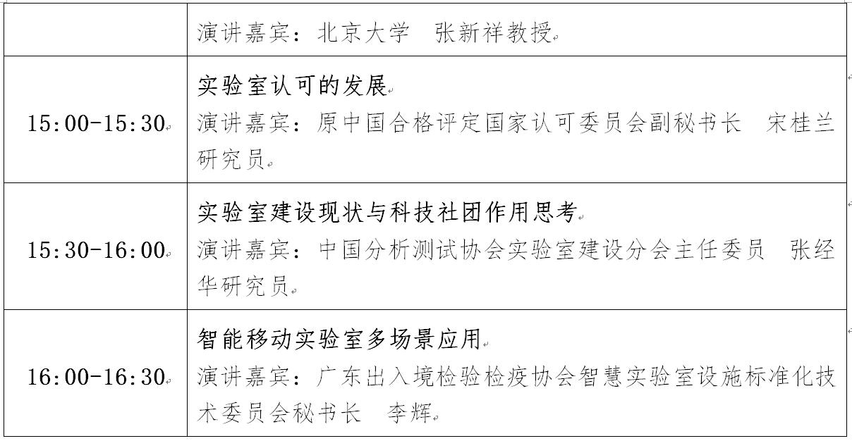 理、實驗室安全、智慧實驗室、認(rèn)可認(rèn)證、試劑及實驗動物、標(biāo)準(zhǔn)物質(zhì)、 實驗室數(shù)據(jù)管理、危化品管理等話題,邀請兩院院士、國內(nèi)外知名專家及 企業(yè)代表作現(xiàn)場主旨報告,就廣大實驗室科研、管理人員、檢測機構(gòu)關(guān)注 的熱點、難點等關(guān)鍵問題現(xiàn)場交流分享,為中國實驗室發(fā)展帶來前沿資訊 和科學(xué)解決方案。本屆大會設(shè)置開幕式、主論壇報告12個議題,12場專題 論壇等多種形式同期活動。