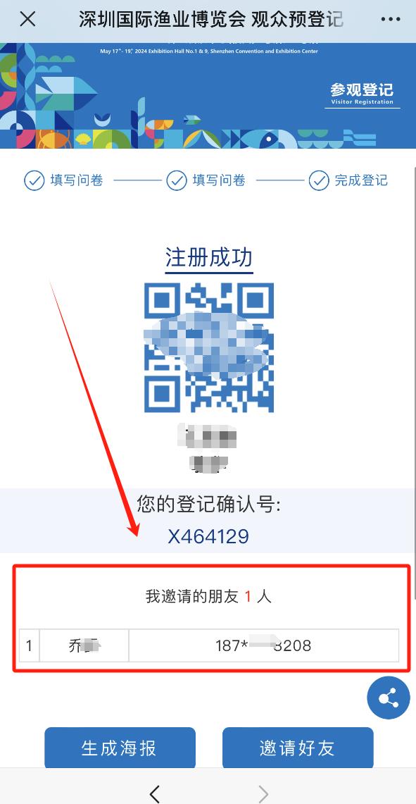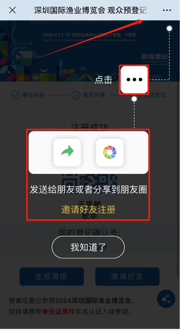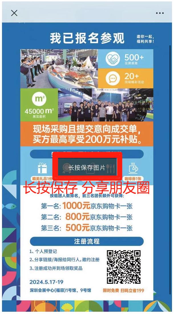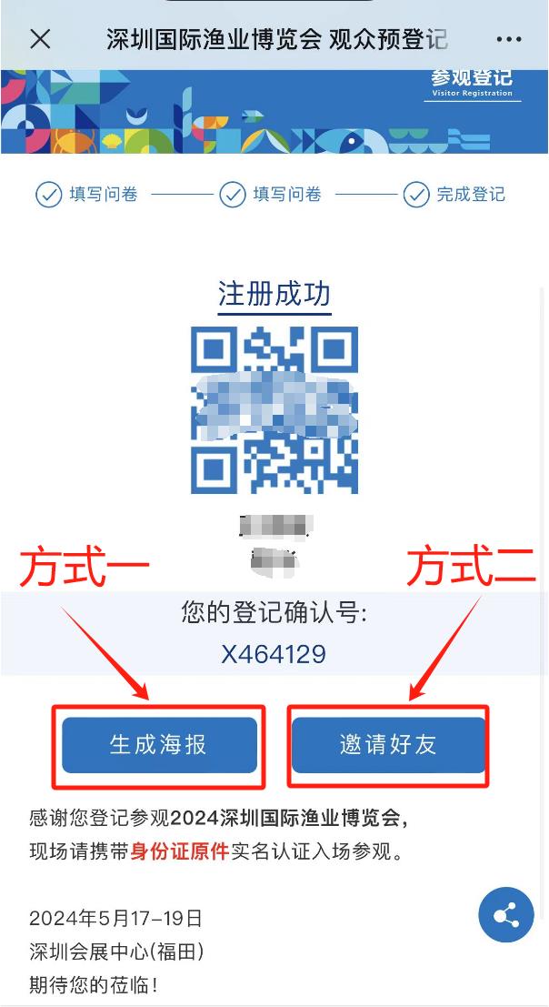 點(diǎn)擊“深圳漁業(yè)博覽會(huì)公眾號(hào)-免費(fèi)領(lǐng)票”菜單欄,完成個(gè)人注冊(cè)后選擇【生成海報(bào)】,長(zhǎng)按保存分享;或者選擇【邀請(qǐng)好友】,分享鏈接給同事/好友/朋友圈。