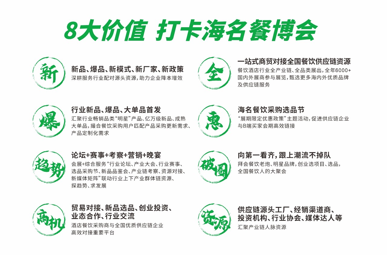 10年磨一劍,海名餐飲供應(yīng)鏈系列展無論在展會規(guī)模、影響力以及展會效果等方面,均取得行業(yè)的認(rèn)同;創(chuàng)新價值模式,打造餐飲供應(yīng)鏈“會展+產(chǎn)業(yè)”綜合服務(wù)平臺。其中海名成都餐博會作為中西部區(qū)域全產(chǎn)業(yè)鏈、全品類、全渠道的行業(yè)盛會,始終引領(lǐng)著餐飲行業(yè)發(fā)展;不僅面向全國用戶展示餐飲供應(yīng)鏈領(lǐng)域的年度新品、爆品、先進(jìn)技術(shù)、定制化解決方案等,更是促進(jìn)行業(yè)發(fā)展,屬于餐飲酒店采購商與全國優(yōu)質(zhì)供應(yīng)鏈企業(yè)高效對接的重要平臺。