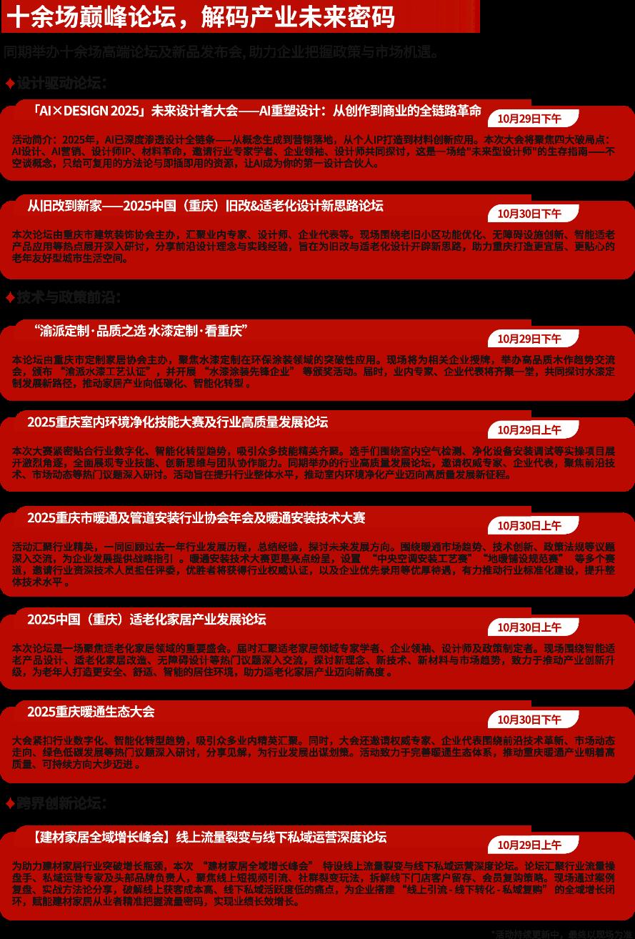 展會期間,組委會將聯合行業協會、權威媒體及頭部企業,舉辦10余場專題論壇,緊扣產業趨勢、產品走向、舊改局改、以舊換新、適老家居、出海貿易、設計師活動、整裝快裝、新媒體營銷等核心議題,匯聚50+位行業領袖、學術專家與先鋒設計師,通過主題演講、圓桌對話、案例剖析等形式,深度解析政策紅利、技術趨勢與市場機遇,為行業提供從戰略到落地的全景式洞察。